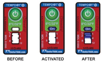 TempDot™Plus標(biāo)簽應(yīng)存儲在室溫下,并必須在反應(yīng)溫度閾值以上被激活。激活是通過用手指推壓。"On"字出現(xiàn)在第一個窗口中顯示激活。之后5分 鐘內(nèi),在反應(yīng)溫度或低于反應(yīng)溫度的情況下將標(biāo)簽貼到產(chǎn)品上。藍(lán)色染料熔化并以控制的速率遷移,,經(jīng)過白色大窗口。這表示暴露在溫度閾值以上的累計時間。當(dāng)溫 度低于閾值時,該染料固化并停止移動。如果溫度超過閾值,TempDot®Plus標(biāo)簽提供即時的視覺跡象。