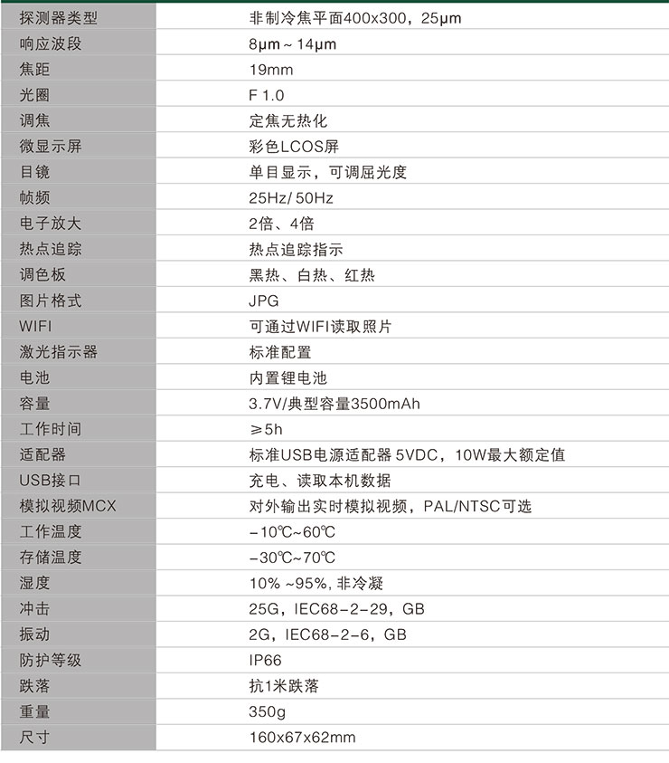 產(chǎn)品特點(diǎn) 可拍照,醫(yī)用紅外熱像儀的用途,并通過(guò)WIFI分享所拍攝照片,方便多人同時(shí)瀏覽 直觀的按鍵功能操作,意大利紅外熱像儀,無(wú)需培訓(xùn),進(jìn)口紅外熱像儀廠家,符合人體工學(xué)設(shè)計(jì),焦平面紅外熱像儀,長(zhǎng)期使用依 舊舒適 超靜音和防漏光設(shè)計(jì),高德 紅外熱像儀,使用時(shí)不暴露自身 內(nèi)置式鋰電池,5小時(shí)超長(zhǎng)電池使用時(shí)間,中級(jí)紅外熱像儀,并可外接便攜電源持續(xù)使用 標(biāo)準(zhǔn)Micro USB充電接口,高速紅外熱像儀,適應(yīng)多種充電方式(適配器/車載點(diǎn)煙器/電腦/充 電寶) 激光指示器可用于目標(biāo)指示 IP66超強(qiáng)防護(hù)等級(jí),抗1米跌落,適應(yīng)野外使用環(huán)境