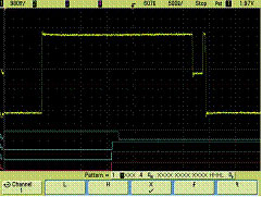 當(dāng)您觀察復(fù)合調(diào)制模擬信號如前述組合電視信號和馬達(dá)驅(qū)動(dòng)信號時(shí)數(shù)字示波器亮度分級能力具有鮮明的視覺效果。在您調(diào)試數(shù)字電路時(shí),亮度等級對于發(fā)現(xiàn)信號異常也極端重要。圖6是發(fā)現(xiàn)嵌入在脈寬調(diào)制信號(PWM)中矮脈沖的例子?拷魍话l(fā)中心處的亮點(diǎn)表明示波器已捕獲到信號異常。通過在一個(gè)亮點(diǎn)上放大我們能清楚看到如圖7所示的信號異常細(xì)節(jié)。雖然模擬示波器也能通過重復(fù)掃描顯示亮點(diǎn)但模擬示波器不能保存和放大波形。